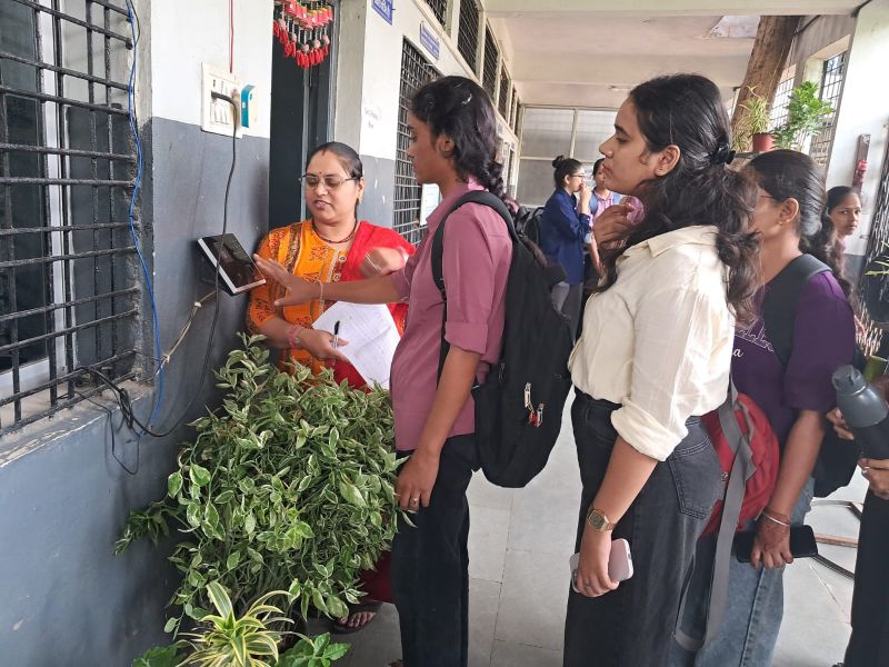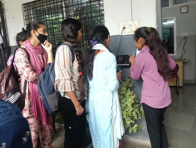 बायोमैट्रिक में रजिस्ट्रेशन करते हुए विद्यार्थी